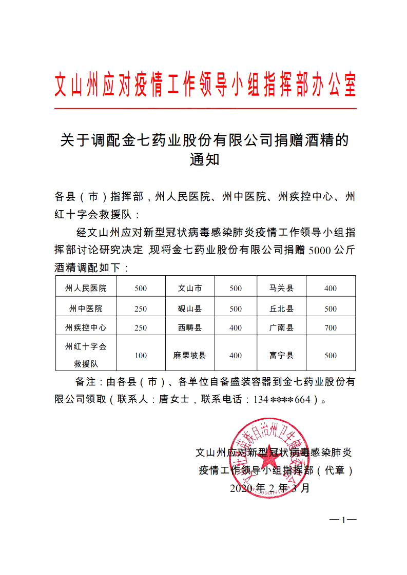 以下為文山州應(yīng)對疫情工作領(lǐng)導(dǎo)小組指揮部“關(guān)于調(diào)配金七藥業(yè)股份有限公司捐贈酒精的通知”,看到酒精的調(diào)配去向,我們心情格外沉重,很多縣份距離我們有來回六七個小時的車程。
