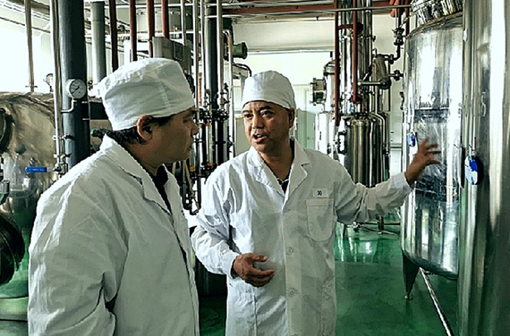 張?jiān)粕麻L(zhǎng)(右)在全封閉式生產(chǎn)車間向作者秦順福介紹三七系列產(chǎn)品現(xiàn)代化取純工藝流程