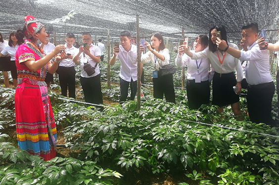 金七藥業(yè)工作人員向前來(lái)參觀考察者介紹三七種植基地情況