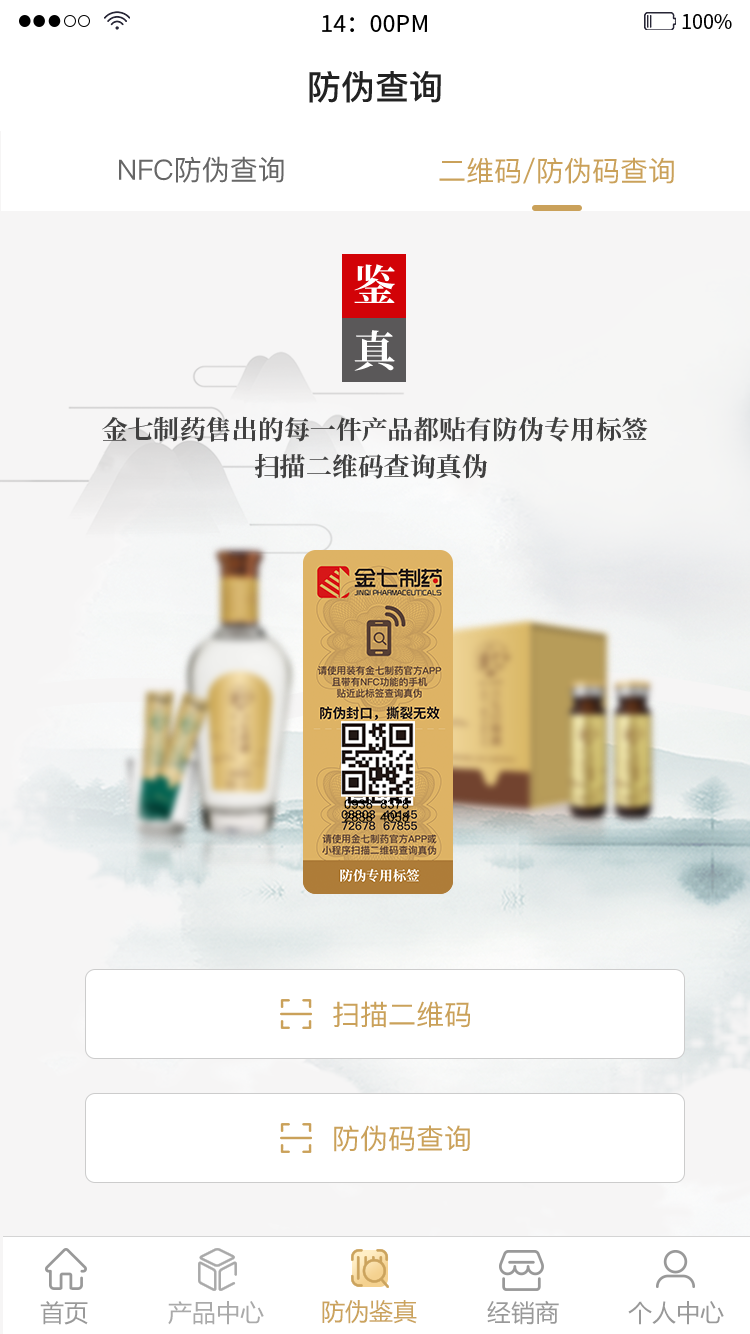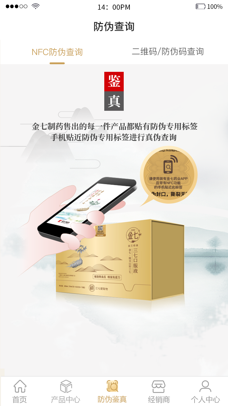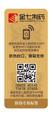 金七藥業(yè)售出的產品都貼有防偽專用標簽,請使用裝有金七藥業(yè)官方APP且?guī)в蠳FC功能的手機貼近防偽專用標簽進行真?zhèn)尾樵儭?注:蘋果手機暫不支持NFC功能)
