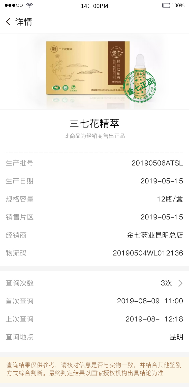 此外,NFC防偽標簽還承載了豐富的信息。使用裝有金七藥業(yè)官方APP且?guī)в蠳FC功能的手機貼近此標簽,除了可以查詢產品真?zhèn)涡畔⑼猓€可以讀取產品的其他相關信息:生產批號、生產日期、規(guī)格容量、經銷商、物流碼,還可在APP上看到該產品的防偽查詢記錄。