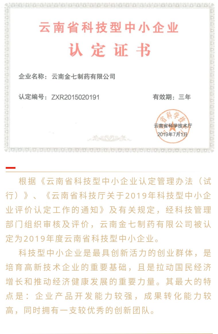 【喜訊】云南金七制藥被認(rèn)定為2019年度云南省科技型中小企業(yè)