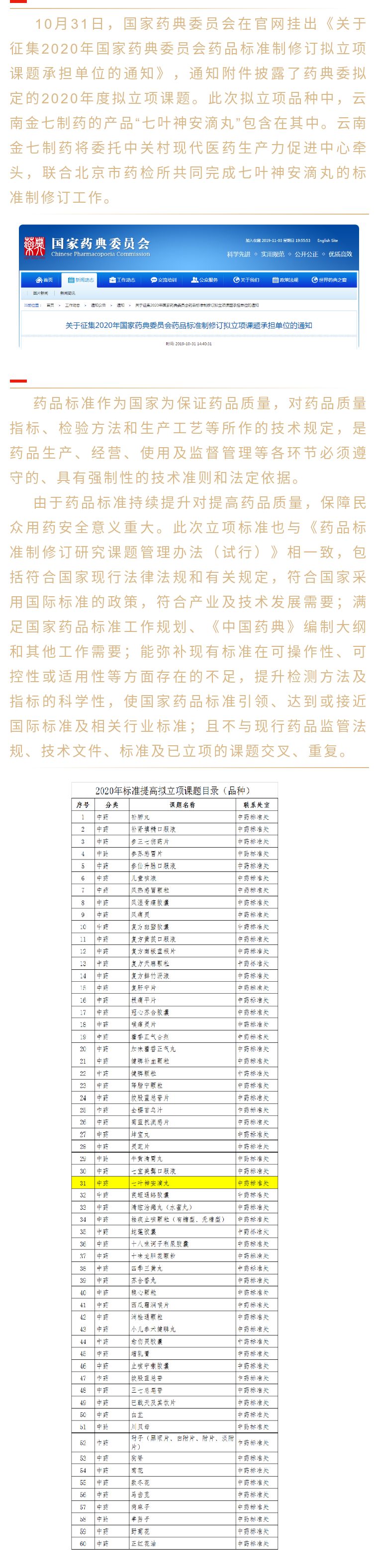 【資訊】“七葉神安滴丸”入選藥典委擬定的2020年標(biāo)準(zhǔn)提高擬立項課題,云南金七制藥將委托中關(guān)村現(xiàn)代醫(yī)藥生產(chǎn)力促進(jìn)中心牽頭,聯(lián)合北京市藥檢所共同承擔(dān)該課題研究