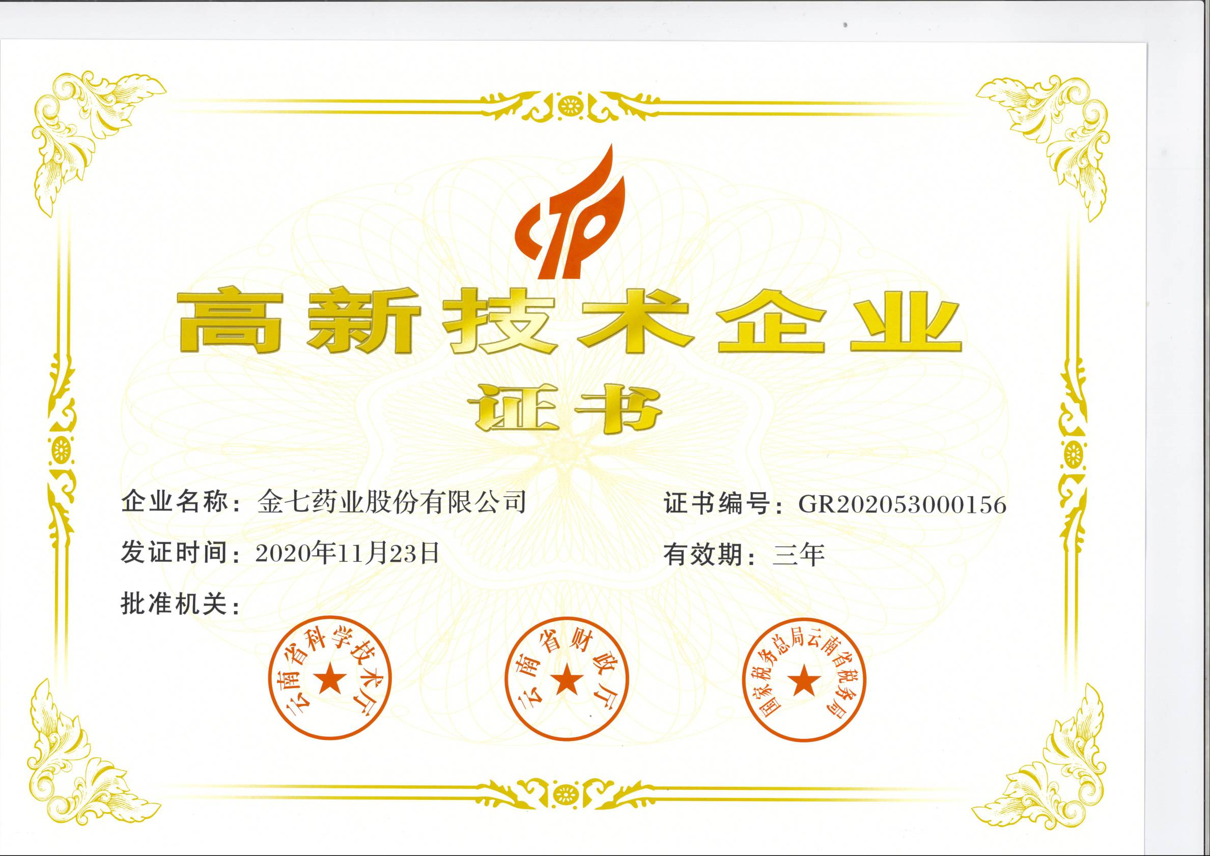 近日,金七藥業(yè)股份有限公司獲得了由云南省科學(xué)技術(shù)廳、云南省財(cái)政局、國家稅務(wù)總局云南省稅務(wù)局聯(lián)合頒發(fā)的“高新技術(shù)企業(yè)”證書,該證書的獲得,表明了國家對(duì)公司在技術(shù)、研發(fā)、創(chuàng)新上的認(rèn)可,從此金七藥業(yè)股份有限公司邁入了國家高新技術(shù)企業(yè)的行列。