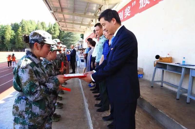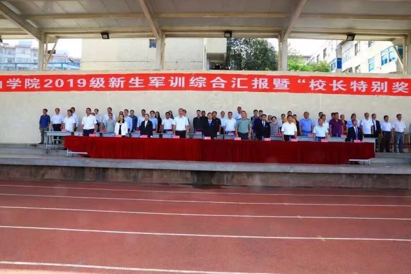 在舉國上下同慶新中國成立70周年的背景下,9月12日下午,文山學(xué)院2019級新生軍訓(xùn)匯報表演暨“校長特別獎”頒獎大會在學(xué)校足球場隆重舉行。文山軍分區(qū)黨委常委、文山州學(xué)生軍訓(xùn)辦主任、文山軍分區(qū)戰(zhàn)備建設(shè)處處長羅鐵斌,文山州委教育工委書記、州教育體育局黨組書記、局長、文山職業(yè)技術(shù)學(xué)院和文山技師學(xué)院籌建處處長袁加全,副處長陳凌等領(lǐng)導(dǎo)及金七藥業(yè)股份有限公司董事長張云生等18家捐資助學(xué)企業(yè)代表出席了大會,黨委副書記、校長李炳澤在大會上致辭,大會由黨委副書記馮林虎主持,學(xué)校在家校領(lǐng)導(dǎo),相關(guān)部門、各二級學(xué)院負(fù)責(zé)人及2019級軍訓(xùn)團全體人員三千余人參加了大會。