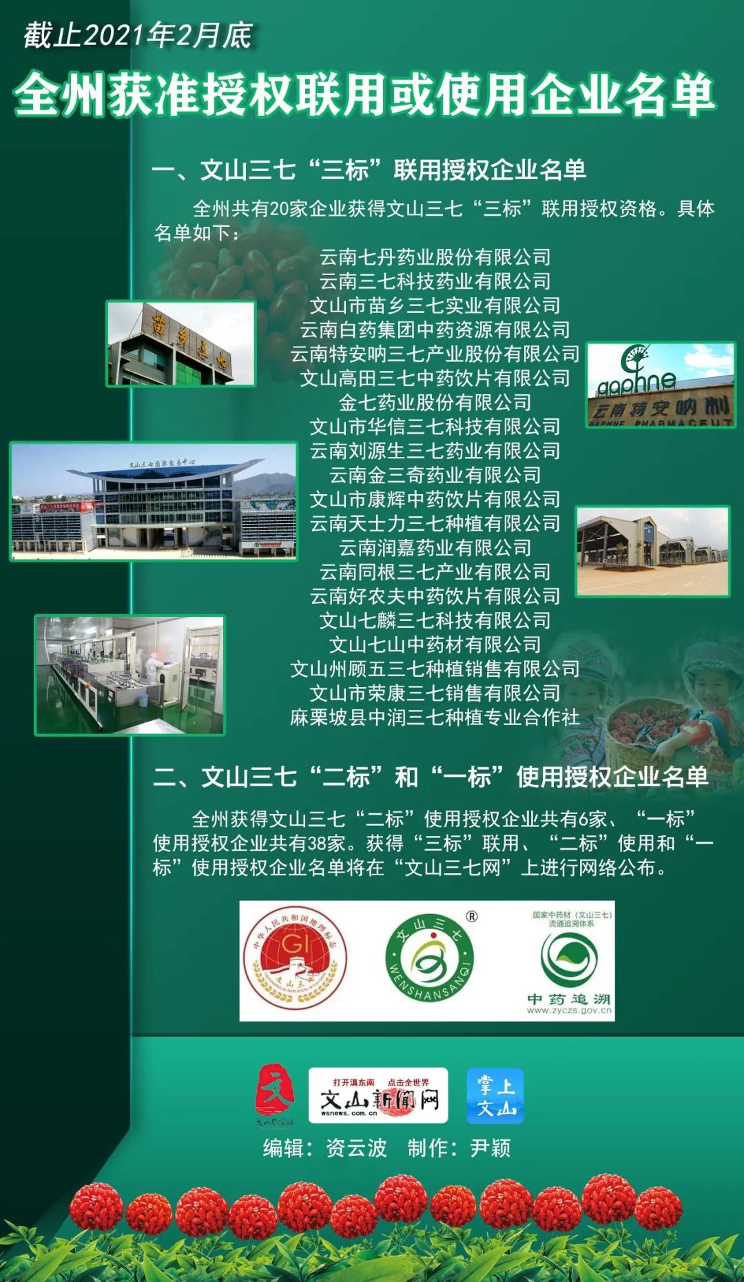 附:全州20家獲得文山三七“三標(biāo)”聯(lián)用授權(quán)資格企業(yè)名單