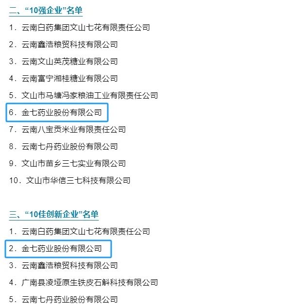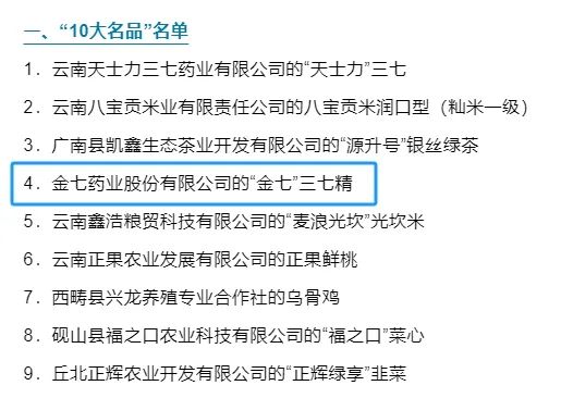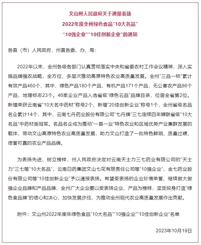 為深入實(shí)施文山州品牌強(qiáng)農(nóng)戰(zhàn)略全方位、多層次推動(dòng),高原特色農(nóng)業(yè)高質(zhì)量發(fā)展。近日,文山州人民政府發(fā)布了《關(guān)于通報(bào)表?yè)P(yáng)2022年度全州綠色食品“10大名品”“10強(qiáng)企業(yè)”“10佳創(chuàng)新企業(yè)”的通知》,金七藥業(yè)再次入選文山州綠色食品“10強(qiáng)企業(yè)”“10佳創(chuàng)新企業(yè)”,“金七牌”三七精成為文山州2022年度綠色食品“10大名品”。
